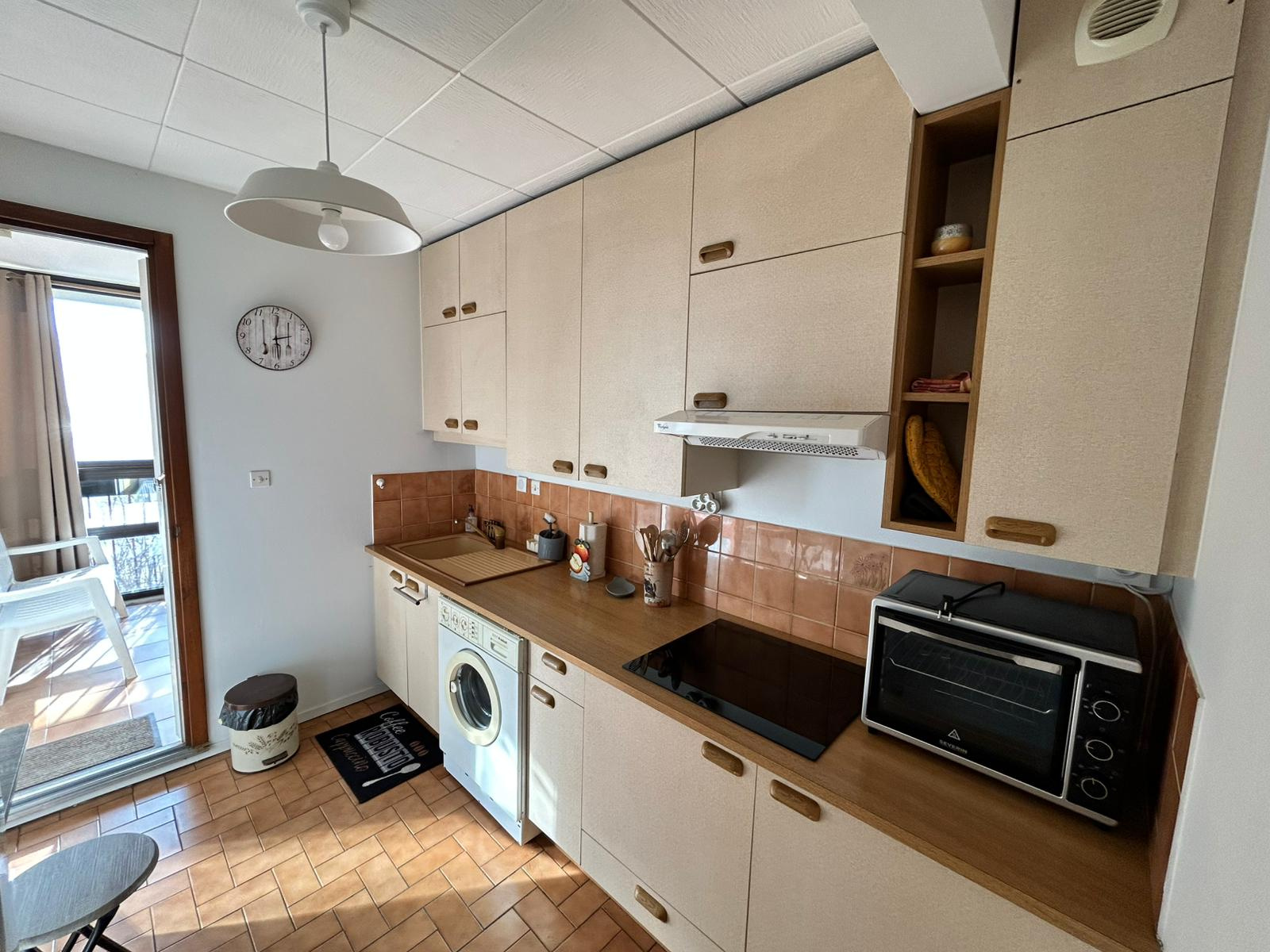 Hall d'entrée; Séjour de 24m² donnant sur deux loggias fermées de 1m² et 5m² ; Cuisine séparée, aménagée et équipée (réfrigérateur, mini-four, plaque, hotte, four micro-ondes) ; Deux chambres de 9m² et 11m² avec placards, l'une donnant sur une terrasse de 7m2 et l'autre sur la petite loggia ; Salle d'eau avec meuble vasque et douche ; WC séparé ; Pièce à usage de rangement avec congélateur.