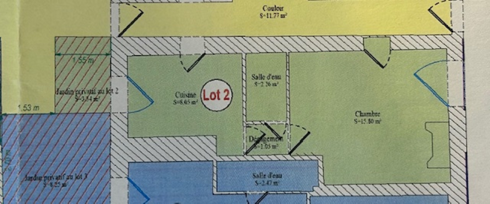 Entrée ouvrant sur la cuisine aménagée de 9.6m²; Chambre de 15.8m² avec placard; Salle d'eau de 2.3m² avec WC.